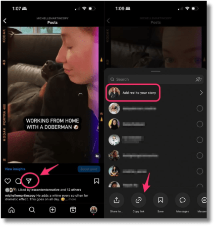 - From the sharing menu, select the “Add Reel to Your Story” option. This will open up the Story editor with your Reel already added as the background.