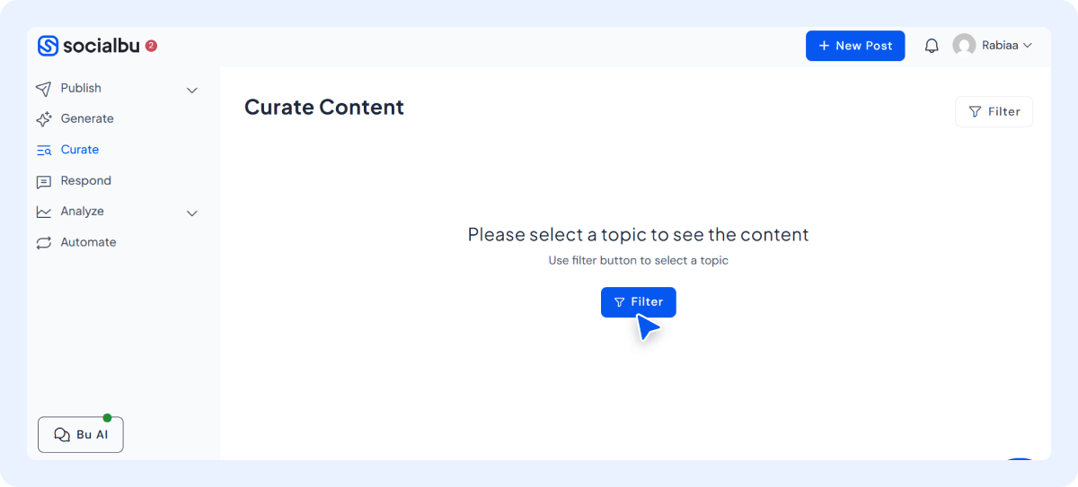 So, now from your SocialBu dashboard, click on the “Curate” option in the left-hand menu. This is where the AI begins to work for you.