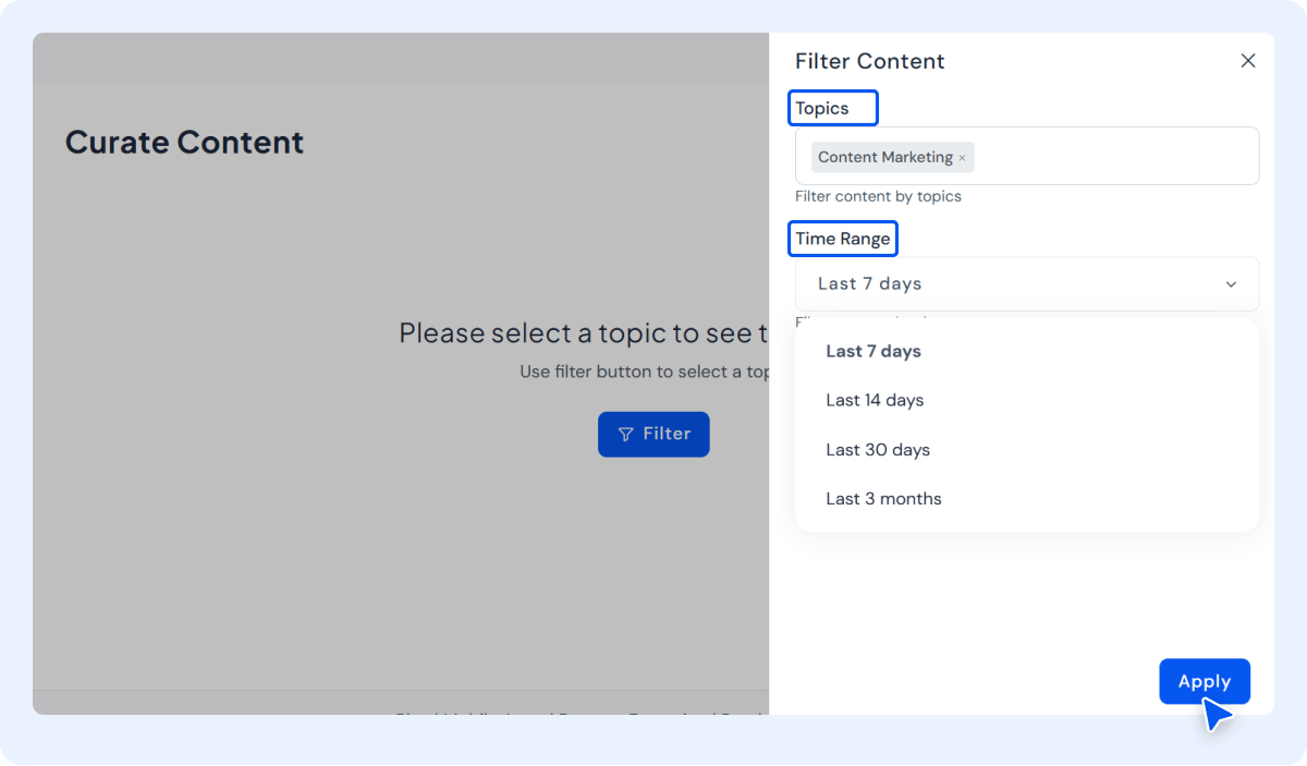 Click it and enter a topic, keyword, niche relevant to your brand, or time ranges (e.g., “Last 14 days”) and hit the “Apply” button. This machine learning content filtering system supports a wide range of industries, enabling you to narrow down or refine your results.