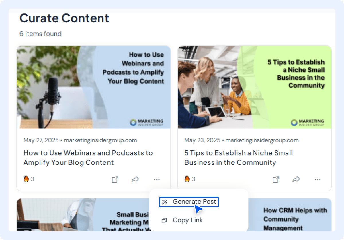 Instead of spending hours researching and drafting posts, AI helps find and recommend the best content for your brand in seconds.