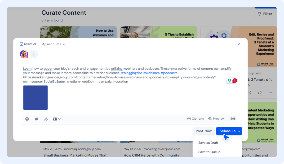 Once your post is ready, choose to post it immediately, schedule it for a specific time, or add it to your content queue. This is where social media scheduling automation kicks in—SocialBu handles it from here.