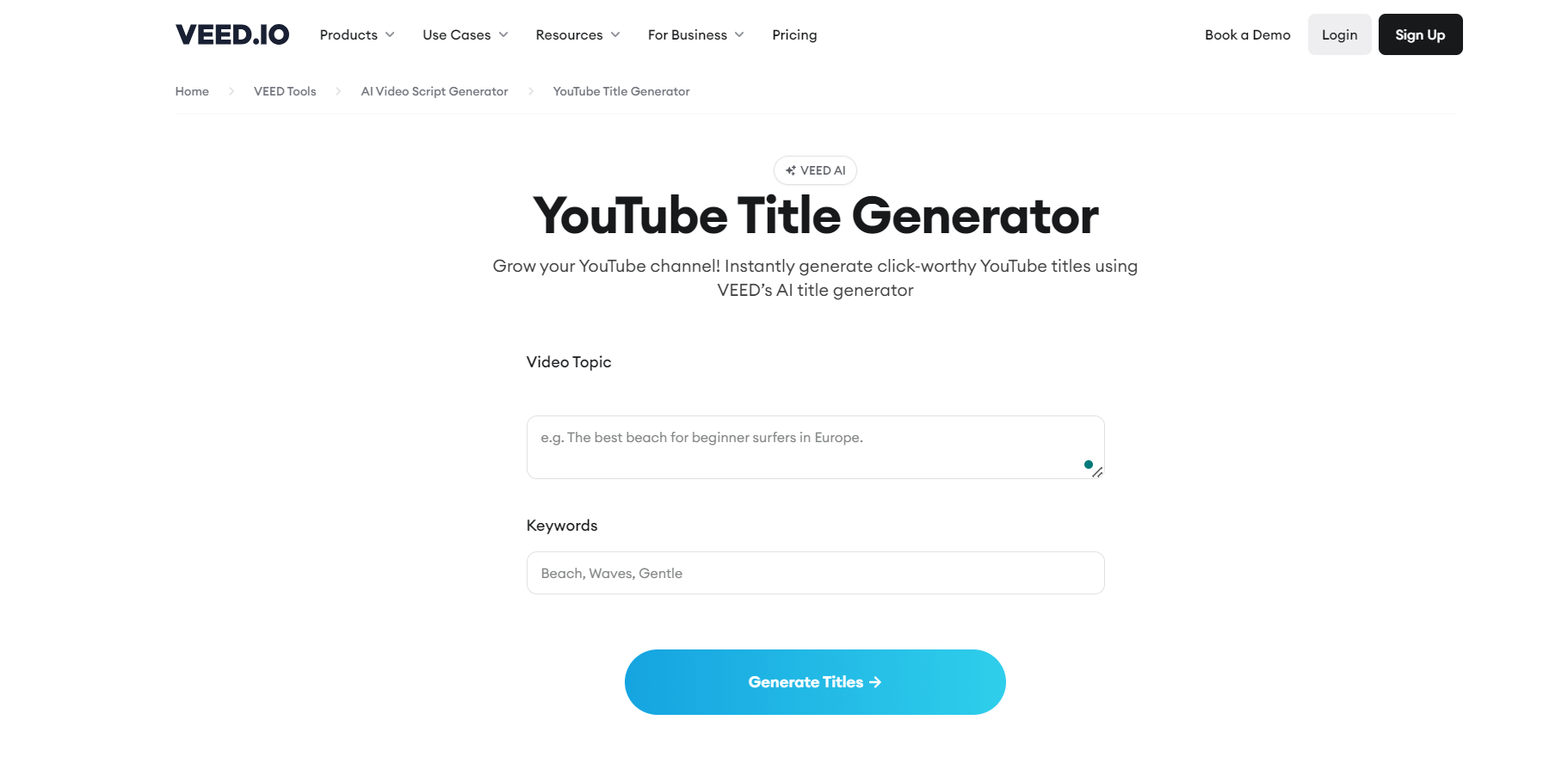Veed.IO is a multi-purpose video editing suite with a built-in title suggestion feature. Add your video’s topic and keywords, and Veed.IO will analyze it to generate creative title ideas optimized for SEO.