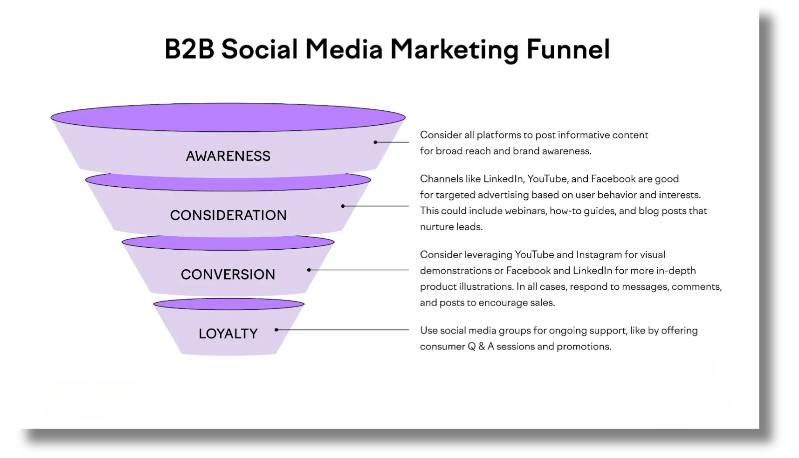 A B2B social media channel strategy involves selecting the most appropriate platforms to reach and engage with a business audience. It considers factors like target audience demographics, content formats, and marketing objectives to determine which channels will be most effective for a B2B company’s social media efforts.
