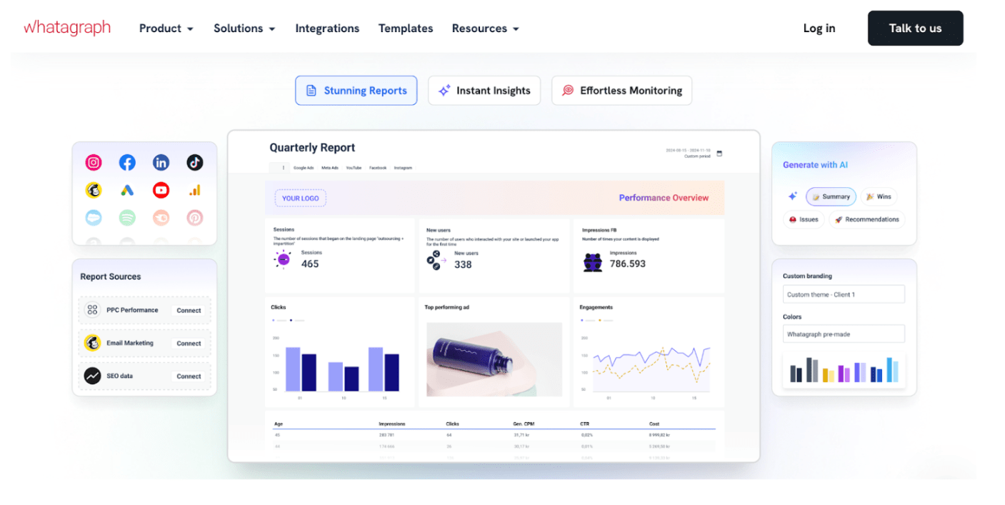 Whatagraph is a performance monitoring and reporting tool that can do much more than social media analytics. You can use it to build a cross-channel dashboard for all your social media channels and analyze insights in one place using advanced visualisations or AI.