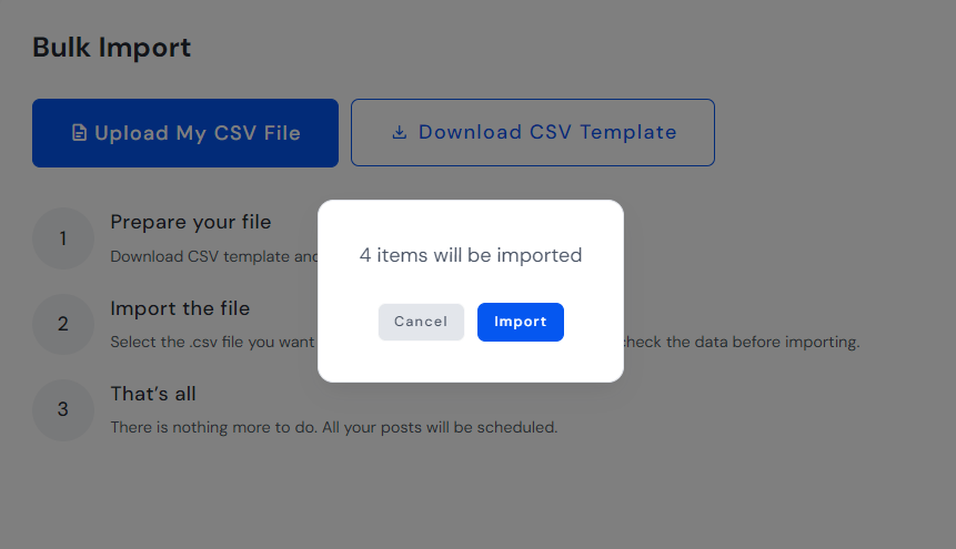 After uploading the file, a pop-up will prompt you to import the posts from your CSV.
