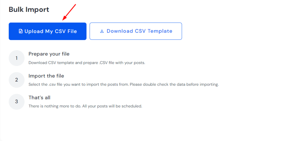 Once you’ve entered all your post details in the CSV template, return to SocialBu and upload the file using the bulk import tool.