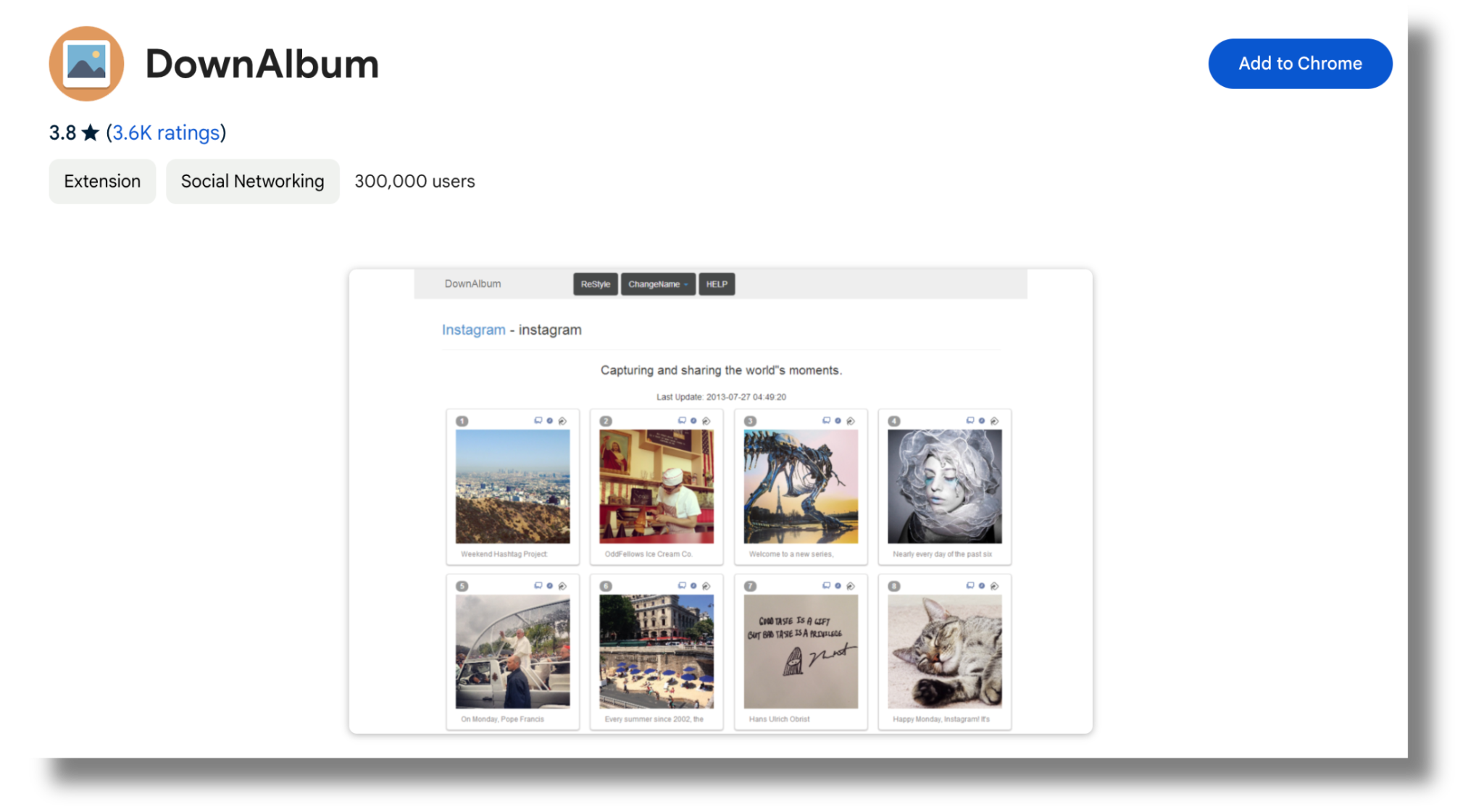 DownAlbum is a user-friendly Facebook photo download extension that shines for its seamless integration with Chrome, Firefox, and Edge. As you navigate albums and profiles, DownAlbum automatically detects downloadable photos, offering various resolutions and formats to suit your needs.