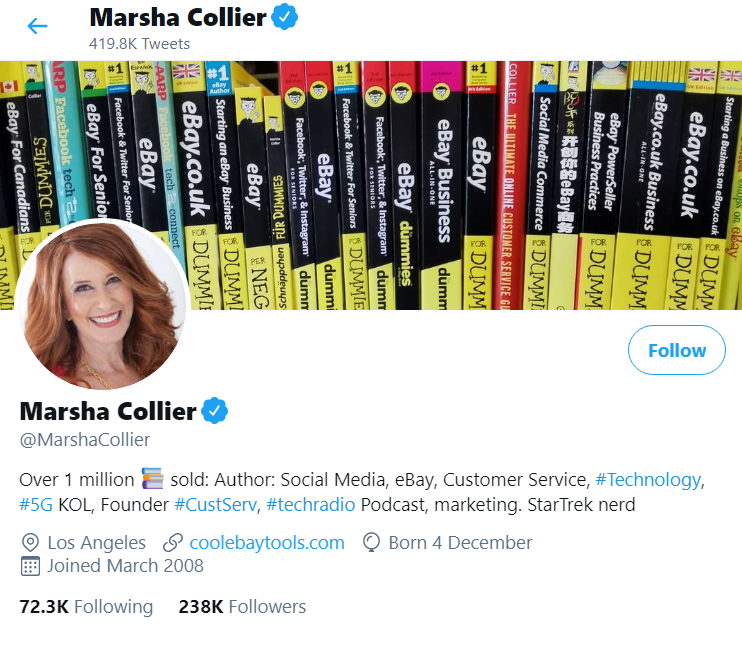 Your profile should show who are you, what is your business, what you talk about, etc. So, profile visitors know what to expect from you. Marsha Collier‘s Twitter profile is an excellent example.
