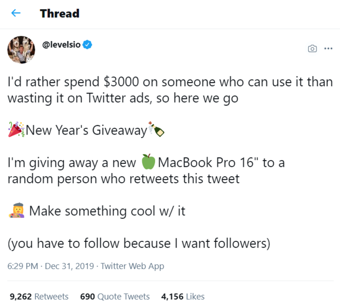 Before running a contest, define your contest goal? Brand awareness or a new product promotion or what it is. Then choose an attractive prize considering your audience’s interests. Then set up terms and conditions to enter the contest. Personally, I like “retweet and follow” to enter the contest. This “follow” part increases your followers rapidly and “retweet” brings more brand awareness and contest participants. @levelsio did a MacBook Pro contest in December 2019, he ended up with 10K new followers on Twitter.