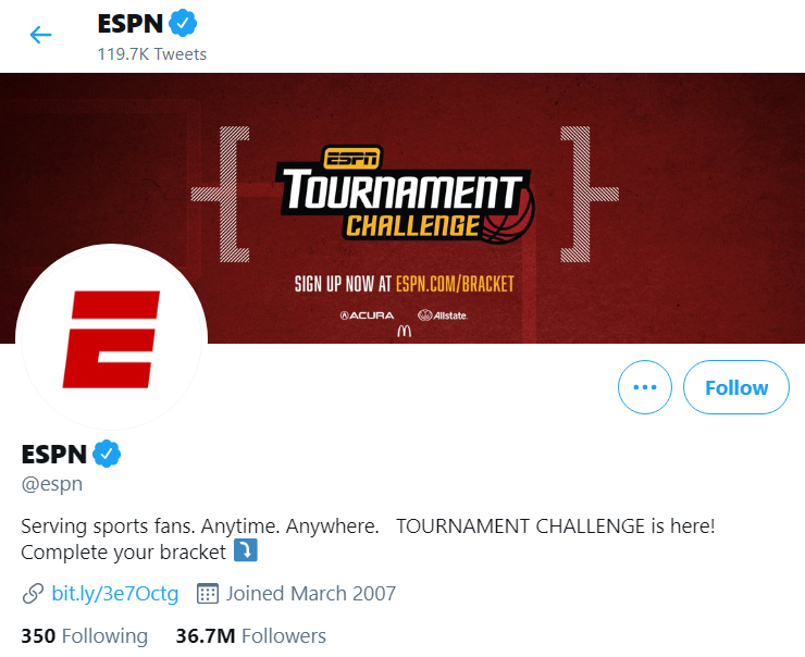 Choose a header photo that complements your profile picture. Or, use it as a place for the promotion of your latest service or product. Just like @espn is using it for promoting their tournament challenge.