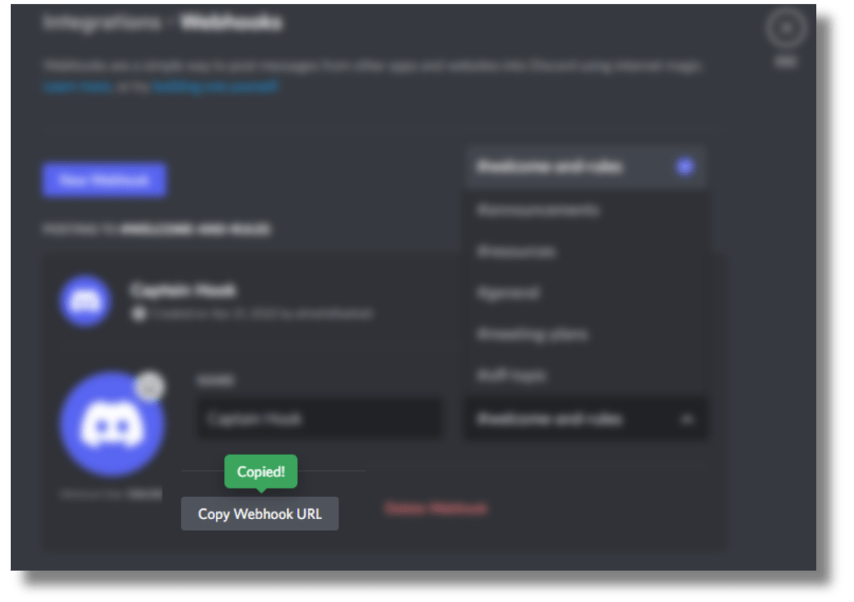 You must first create a webhook in your Discord server to get the webhook URL. After navigating to the Integrations tab and clicking on Create Webhook, you will be prompted to configure your webhook settings. You can click the Copy Webhook URL button once you have set the name and selected the channel.