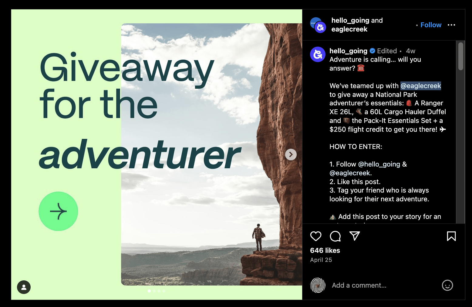 Going joined forces with Eagle Creek and organized a national park-themed giveaway on Instagram. This is an example of teaming up with a brand from an adjacent industry with a shared, overlapping audience.