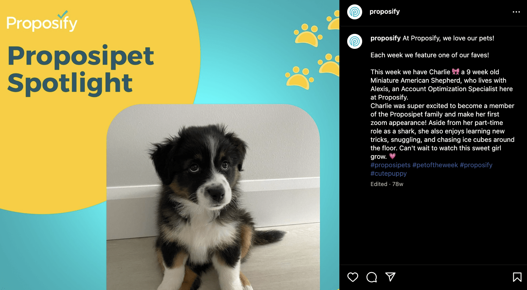 Proposify’s Instagram is jam-packed with photos and videos of their entire team. The brand is super pet-friendly to the extent that they established the Proposipet Spotlight posts where employees introduce their fur babies.
