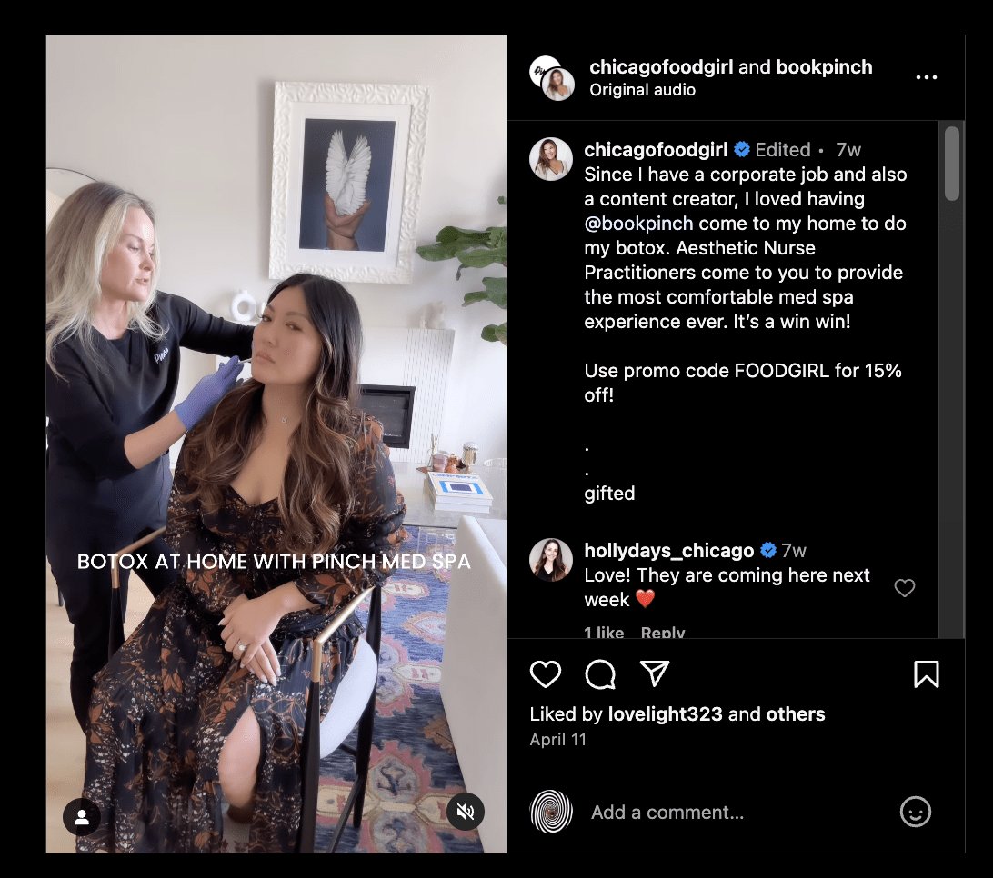The Pinch Med Spa Instagram is a great example of UGC done right. It’s packed with happy customers’ photos and videos of themselves getting beauty treatments and demonstrating the results. This approach adds credibility to the brand and encourages others to share their experiences, creating a cycle of engagement and trust.