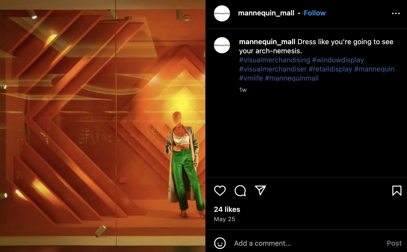 Mannequin Mall showcases their brand persona through the use of funny captions combined with visually appealing displays. This approach creates an engaging and memorable experience for their audience while highlighting their fashion-forward and playful brand identity.