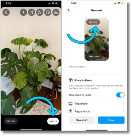 Step 4: Once satisfied, click on the arrow to proceed to the caption and sharing options. Tap on “Preview” to make sure your Instagram Reel is ready to be shared the way you like it. Write some text and add hashtags in the caption box.