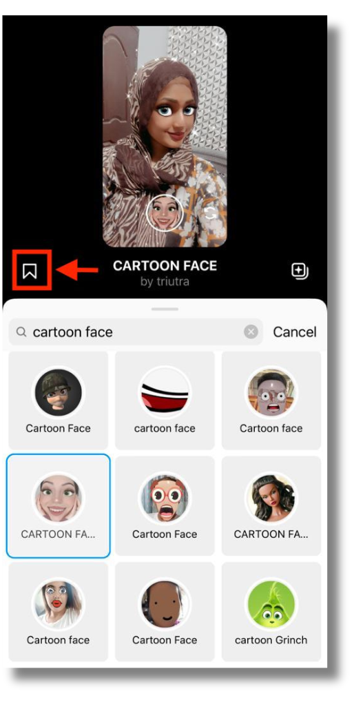 Although the cartoon face filter can be used on both photos and videos, it works best on close-up shots of your face. If you try to use this effect on a group photo or a photo that includes your entire body, the filter may not work as efficiently.