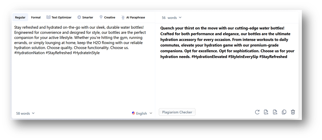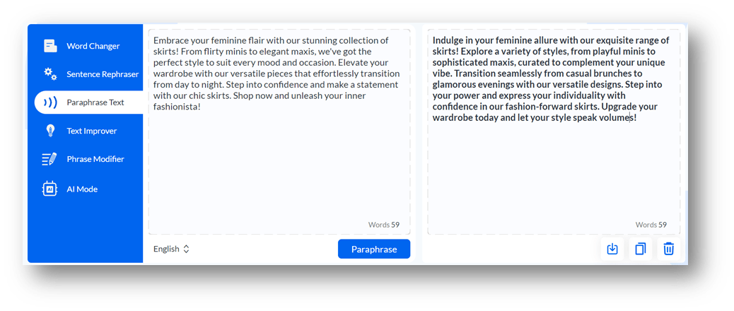 The tool improves the quality of your copywriting by introducing new words that are persuasive and engaging in it. This helps persuade the readers to take action. Here is a screenshot of Paraphraseonline.io, showing it does what we just said to the ad copy we provided.