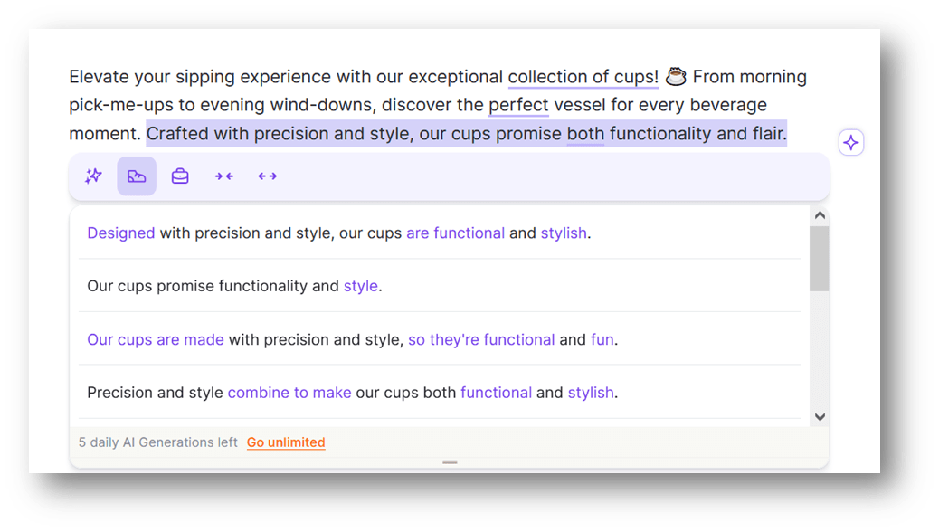 - Provides multiple variations of the copywriting.