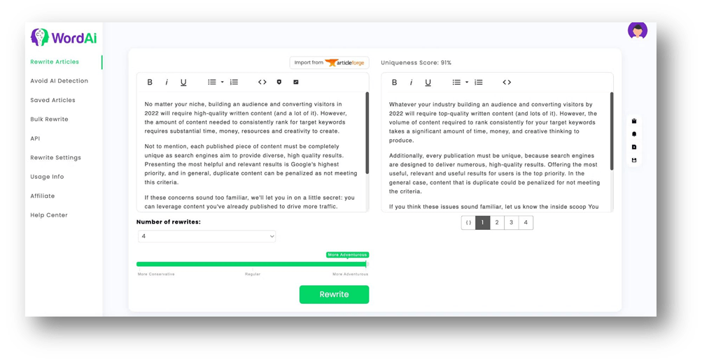 WordAi is another online writing platform that offers multiple tools for bloggers, copywriters, and marketers. One of the tools it offers is the “Rewrite Articles” one. This is basically a rewriting tool that is pretty similar to a paraphraser. In fact, it does the same things a paraphrasing tool would normally do. This is why we’re adding it to this list.