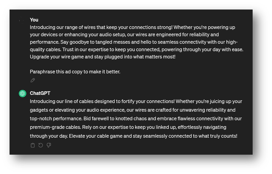 It is free to use but offers a premium version as well. However, for casual users and occasional copywriters, the free version will be enough. Here’s a screenshot of ChatGPT paraphrasing our ad copy simply because we asked it to do so.