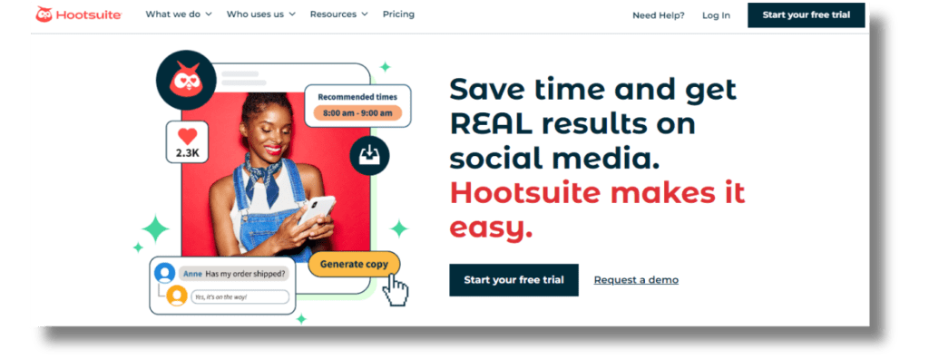 Hootsuite is one of the most comprehensive platforms where you can perform various social media tasks. You can schedule content and select times your audience will most likely engage.
