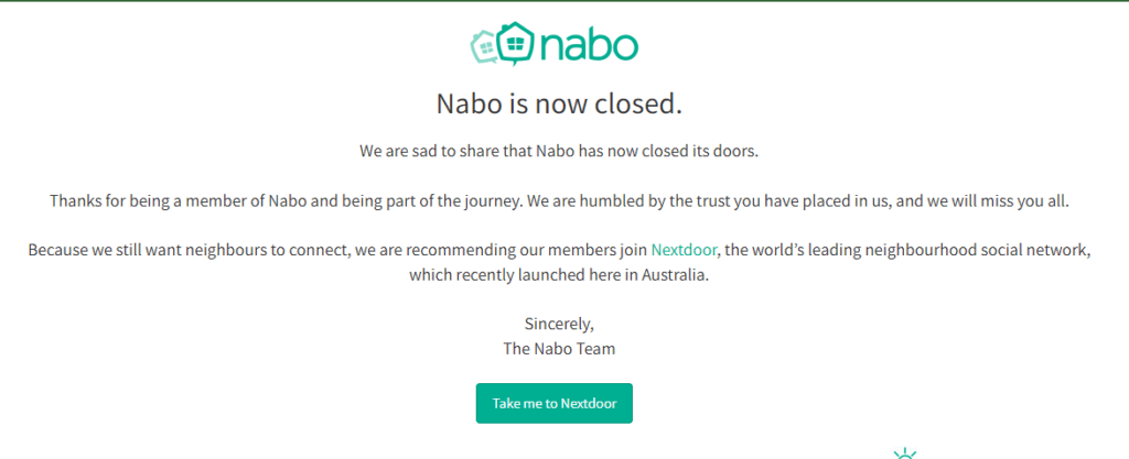 Before its shutdown, Nabo lived in over 6000 neighborhoods and had plans to be as big as Facebook.