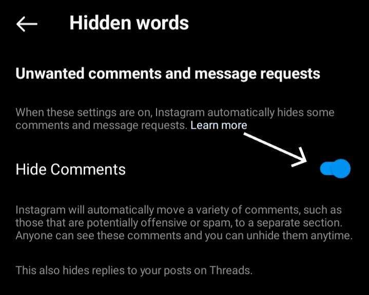 • Tap “Hidden Words” and enable “Hide Comments.”