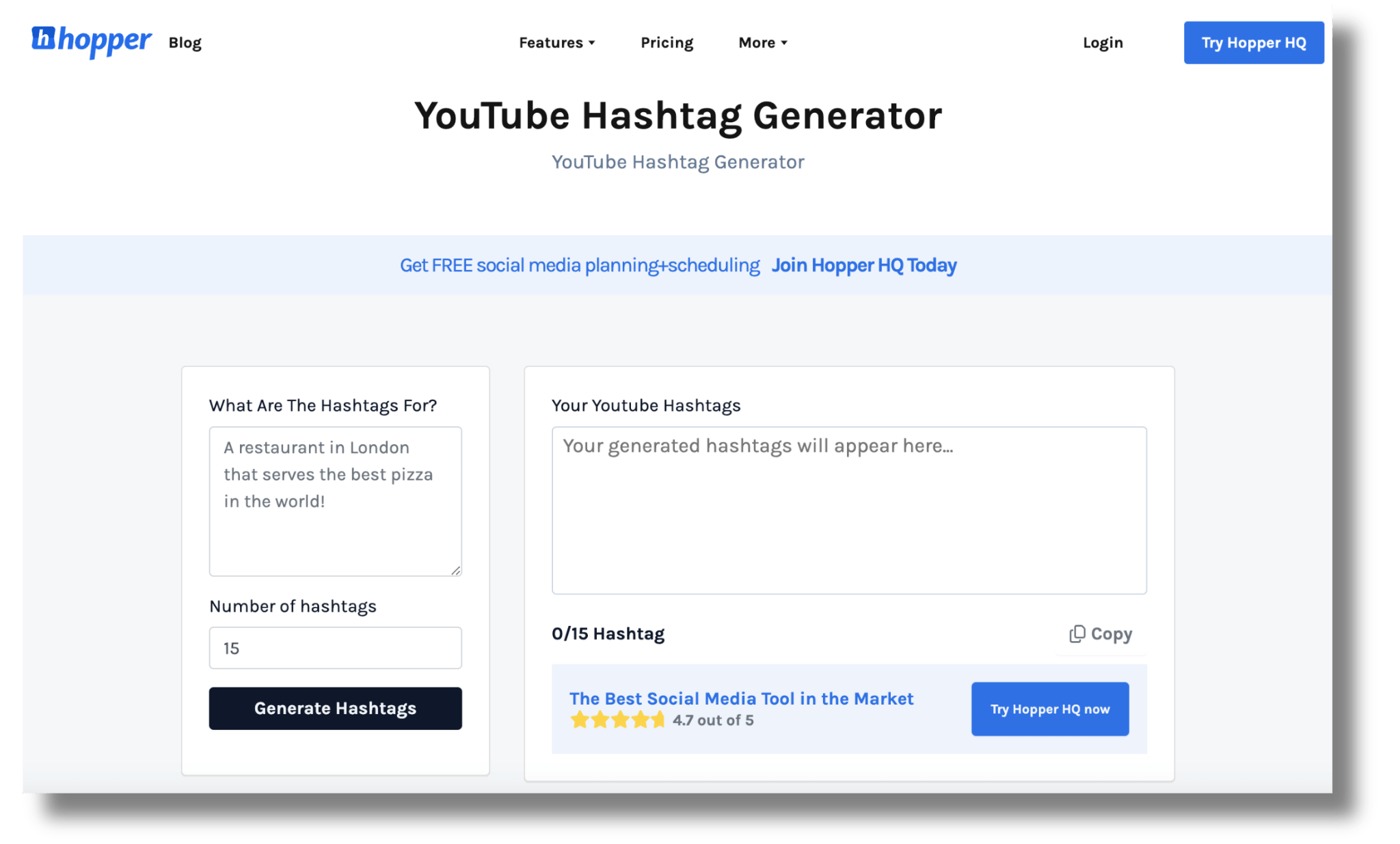 Hopper HQ offers a user-friendly YouTube hashtag generator that provides a curated list of trending and relevant hashtags for YouTube Shorts and long-form videos. It allows for customization based on content type and subject, making it accessible for beginners and experienced users alike.