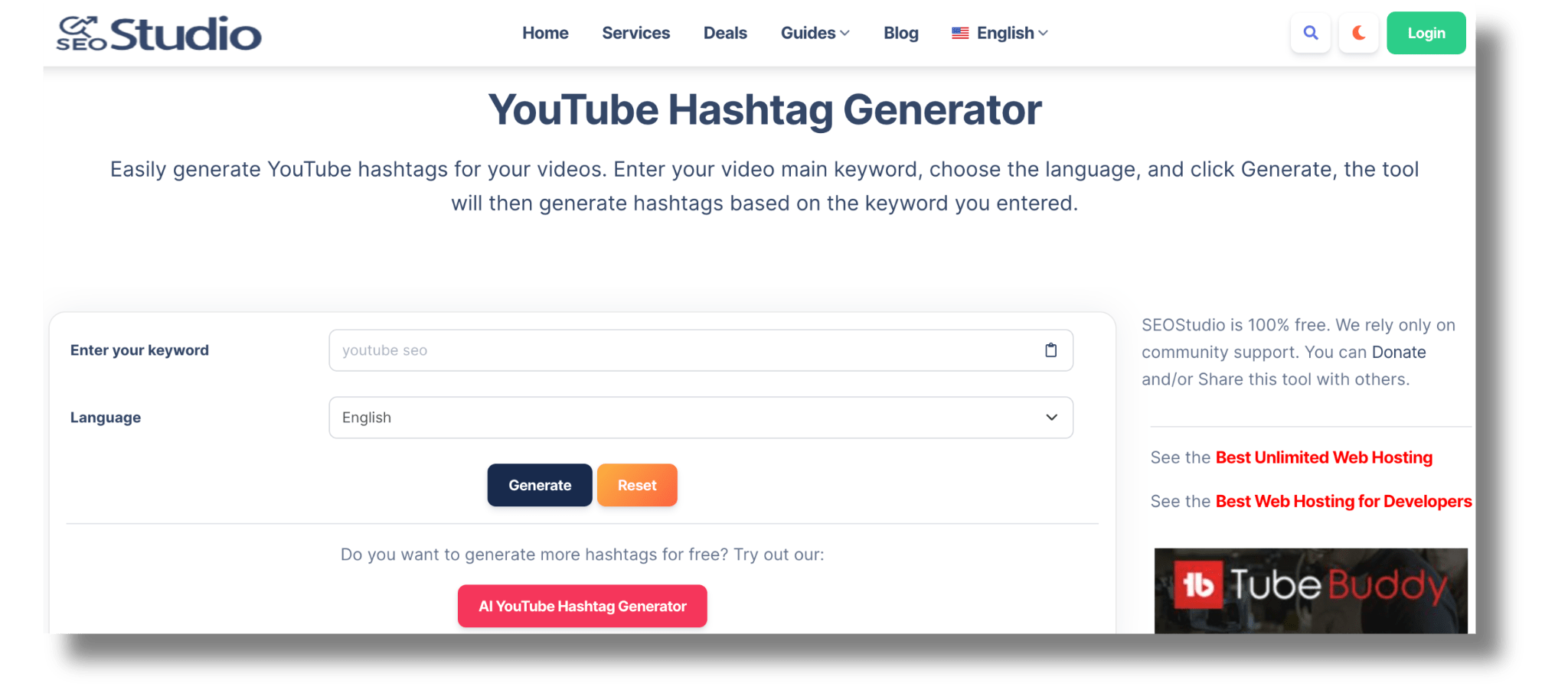 SEOStudio is a comprehensive suite of tools designed to help YouTube creators optimize their content for improved visibility and performance. As part of its offerings, SEOStudio includes a powerful hashtag generator feature to enhance video discoverability.